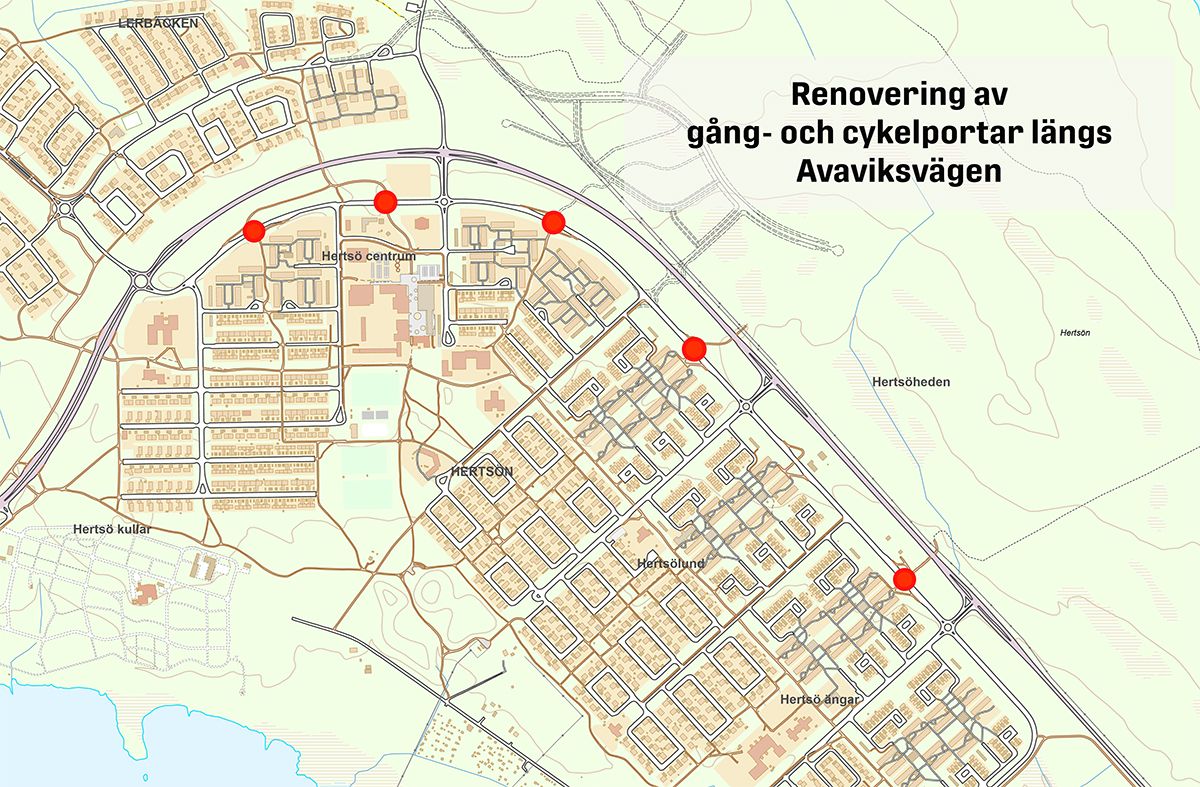 Förstora bildenKarta som visar var vi ska renovera gång- och cykelportar längs Avaviksvägen på Hertsön.
